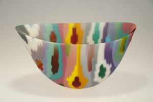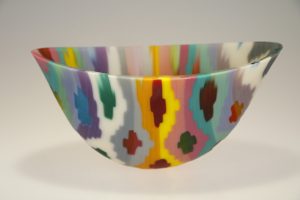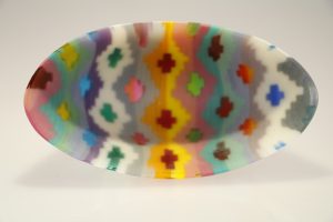 Osian’s Coat vessel is inspired by a coat I knitted for my son when he was a baby. I’ve adapted my knitting technique into a glass tapestry, meticulously cutting and balancing hundreds of pieces of glass replicating the design before fusing and shaping the vessel with gravity in the kiln.